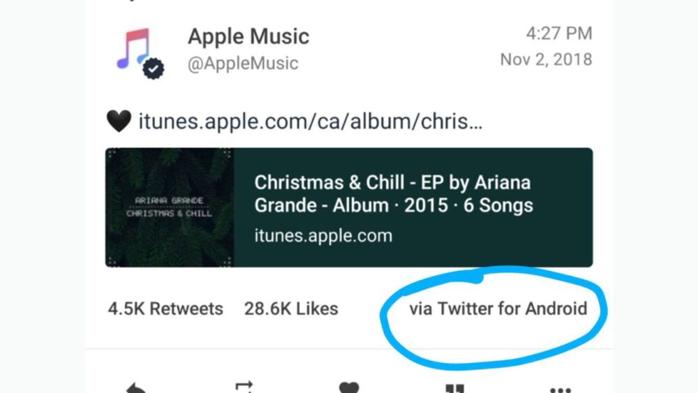 Pasó el 2 de noviembre, pero nadie se dio cuenta hasta el día de hoy. La cantante Ariana Grande realizó la presentación de su nuevo álbum, y la cuenta oficial de Apple Music respondía con un tuit que redirecciona a iTunes. Pero como se visualiza en la información del mensae, Twitter indica desde donde se ha tuiteado. Y efectivamente, decía vía Twitter for Android.